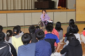 10月7日(火)、大富小学校6年生を対象に福祉教育を行いました。「ともに生きる」と題し、車椅子生活をしている吉田七百子さんと、視覚障がい者ガイドヘルパーや点訳奉仕員などをしている髙橋桂子さんから話をしてもらいました。後半では、6年生全員に、車いす体験とアイマスク体験をしてもらいました。