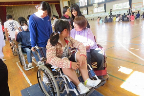 車いす体験では、車いすの使い方を学んでもらい、マットレスを敷いて砂利道と想定し、砂利道の車いすの押し方を体験してもらいました。前輪キャスターを浮かせる操作が難しく、なかなかスムーズな走行ができませんでした。