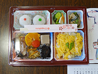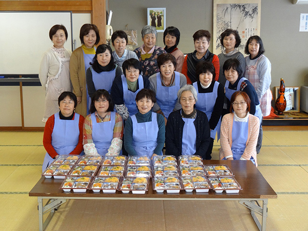 一足早いひな祭りを味わっていただきたいと食生活改善推進員会員みなさんで心を込めて桃の節句『まごころひな弁当』を手作りしたそうです。また、今年のお米は、小田島小学校5年生が作った「小田島米」を使用したそうです。