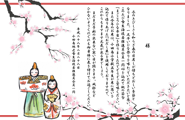 2月28日、(日)小田島地区の食生活改善推進員の皆さんによる手作り弁当「まごころひな弁当」を、地区内の一人暮らしの高齢者42名に民生委員児童委員の方がお届けしました。