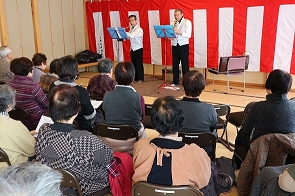 2月15日(水)午後、音楽の素晴らしさを感じながら大いに楽しもうと、仙台市から宴会や慰問のアトラクションで活躍中の「吹くろう」の二人をお呼びしました。演者は、趣味で行っていた演奏活動を、退職後から本格的にやってみたいと練習を重ねた結果、その努力が実って、人前で演奏できるようになったと謙遜しながらお話しておりました。