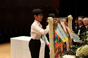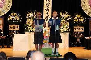 その後、市内小学生を代表して東根小学校の青柳匠朗君、滝口歩さんが平和の千羽鶴奉呈をしました。これは、人権擁護委員東根市部会が、市内の小学生のご協力をいただき、戦没者への慰霊と恒久平和への願いを込めた、平和の象徴である千羽鶴を捧げる、戦後70年事業「平和の折鶴を捧げよう!」でした。