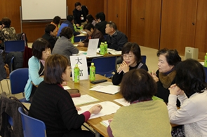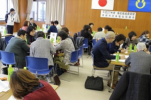 前半は、地区ごとに分かれ、活動を振り返って「区長・民税委員児童委員との連携」「見守り活動」サロン活動等の情報交換を行いました。地区の実状で福祉推進員の活動も様々の中、他区の方の活動状況が聞けて良かったと大変好評でした。