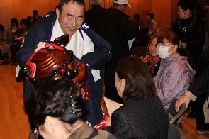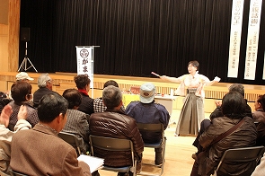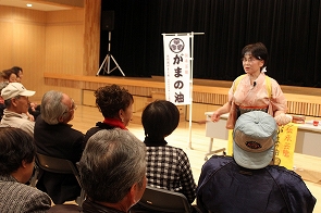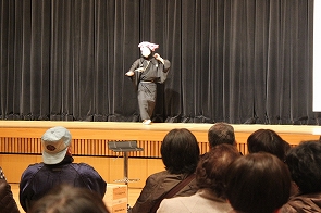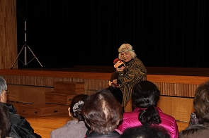 より楽しく、気軽にサロンを運営するために、他のサロン方々と交流を図り情報交換を行い、また、その後サロンで役立つメニューの紹介ということで、ボランティアの方々よりご協力を得て『ガマの油売りの口上』、『語りと腹話術』、『六田大神楽』を紹介させていただきました。とてもよかったと大変好評で、サロンにぜひきてほしいという声がでました。