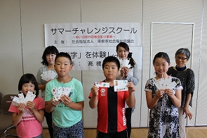 7月28日、サマーチャレンジスクール2日目「点字で体験しよう」を開催しました。 講師の高橋 桂子さん(点訳ボランティア・ガイドヘルパー)から、点字の基礎を学びました。点字は6点の組み合わせで、かな、数字、アルファベット、それに各種の記号類も表しています。みんなで点字盤を使って実際に文字を打つ練習も行い、しおりに点字で自分や家族、友達の名前をうちました。しおりにはシールなども貼り、世界に一つだけのオリジナルのしおりが完成!たくさんのしおりが出来ました。